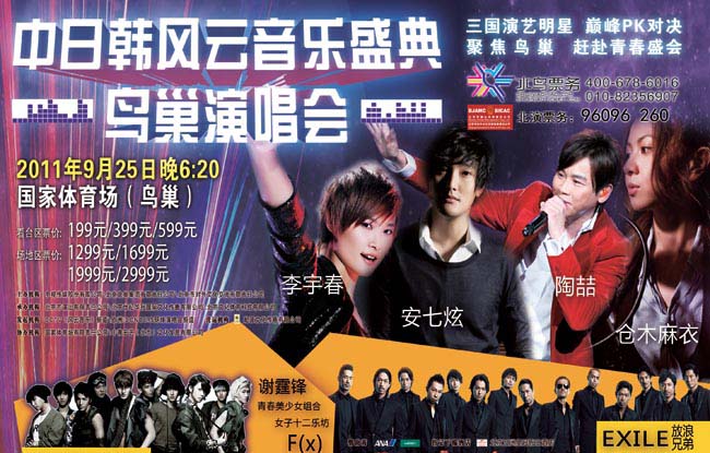 由北京北奧集團(tuán)有限責(zé)任公司、北京市對外文化交流有限責(zé)任公司聯(lián)手中視傳媒股份有限公司共同主辦的“中日韓風(fēng)云音樂盛典鳥巢演唱會”于9月25日晚在北京鳥巢圓滿落幕。此次演唱會以“三國演藝”為主題,旨在促進(jìn)中日韓三國文化與藝術(shù)的交流和溝通,這是北京第一次舉辦如此大規(guī)模的中日韓三國明星演唱會。演唱會于25日晚18:30分開始,持續(xù)三個小時,現(xiàn)場觀眾達(dá)3.5萬人,中國藝人李宇春、謝霆鋒、陶喆等;日本藝人倉木麻衣、EXILE放浪兄弟、HAPPINESS;韓國藝人安七炫、F(x)、Super Junior等紛紛上場,在鳥巢上空吹響了友誼的集結(jié)號,用歌聲和熱情合力為現(xiàn)場的觀眾帶來了亞洲流行音樂的饕餮盛宴。此次中日韓音樂盛典的演員和觀眾以80后、90后為主,可謂是一場年輕人歡聚鳥巢的青春聚會!
